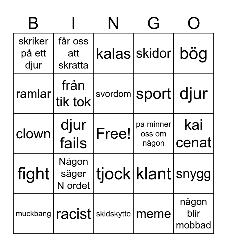 This bingo card has a free space and 24 words: Någon säger N ordet, racist, svordom, muckbang, bög, skriker på ett djur, ramlar, får oss att skratta, på minner oss om någon, tjock, sport, clown, klant, snygg, från tik tok, meme, kai cenat, kalas, djur, djur fails, någon blir mobbad, fight, skidor and skidskytte.