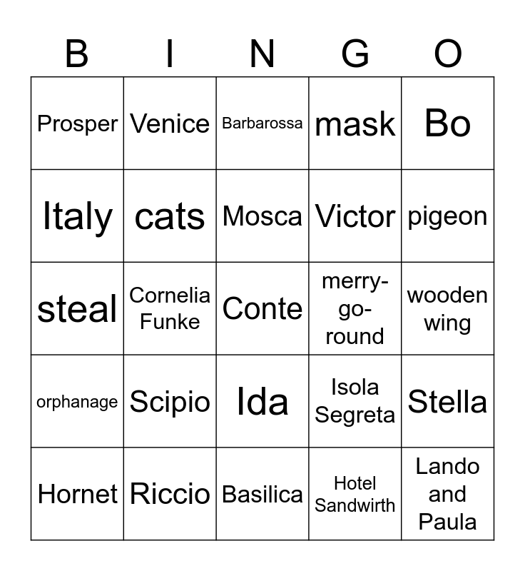 This bingo card has a free space and 24 words: Scipio, Riccio, Mosca, Hornet, Bo, Prosper, Italy, Venice, merry-go-round, Ida, Victor, steal, Isola Segreta, Stella, cats, Hotel Sandwirth, wooden wing, Barbarossa, pigeon, Cornelia Funke, Lando and Paula, orphanage, mask and Basilica.