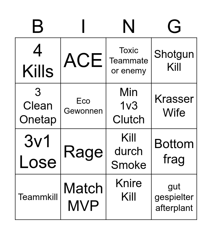 This bingo card has 16 words: Match MVP, Bottom frag, Toxic Teammate or enemy, 4 Kills, 3v1 Lose, ACE, Kill durch Smoke, Knire Kill, 3 Clean Onetap, Eco Gewonnen, Teammkill, Shotgun Kill, Rage, Krasser Wife, Min 1v3 Clutch and gut gespielter afterplant.