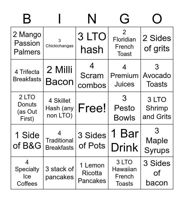 This bingo card has a free space and 24 words: 4 Traditional Breakfasts, 3 stack of pancakes, 4 Scram combos, 4 Specialty Ice Coffees, 2 Sides of grits, 2 Mango Passion Palmers, 4 Trifecta Breakfasts, 3 Chickichangas, 3 Pesto Bowls, 3 Sides of Pots, 4 Premium Juices, 2 LTO Donuts (as Out First), 1 Bar Drink, 3 Maple Syrups, 2 Milli Bacon, 3 LTO Hawaiian French Toasts, 3 LTO Shrimp and Grits, 3 LTO hash, 3 Avocado Toasts, 4 Skillet Hash (any non LTO), 3 Sides of bacon, 1 Side of B&G, 2 Floridian French Toast and 1 Lemon Ricotta Pancakes.