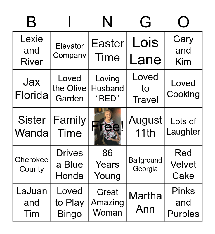 This bingo card has a free space and 24 words: Drives a Blue Honda, Loved to Play Bingo, Loving Husband “RED”, LaJuan and Tim, Gary and Kim, Lexie and River, Jax Florida, Elevator Company, August 11th, 86 Years Young, Loved to Travel, Sister Wanda, Ballground Georgia, Red Velvet Cake, Loved the Olive Garden, Martha Ann, Lots of Laughter, Easter Time, Loved Cooking, Family Time, Pinks and Purples, Cherokee County, Lois Lane and Great Amazing Woman.