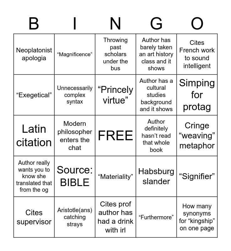 This bingo card has a free space and 24 words: Cites supervisor, Source: BIBLE, “Princely virtue”, “Furthermore”, Cites French work to sound intelligent, Neoplatonist apologia, “Magnificence”, Throwing past scholars under the bus, Author definitely hasn’t read that whole book, Cringe “weaving” metaphor, Latin citation, Unnecessarily complex syntax, Habsburg slander, “Signifier”, “Exegetical”, Aristotle(ans) catching strays, Cites prof author has had a drink with irl, Author has barely taken an art history class and it shows, Simping for protag, Author really wants you to know she translated that from the og, Modern philosopher enters the chat, “Materiality”, Author has a cultural studies background and it shows and How many synonyms for “kingship” on one page.