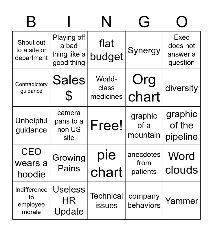 This bingo card has a free space and 24 words: Growing Pains, Useless HR Update, World-class medicines, Indifference to employee morale, Exec does not answer a question, Shout out to a site or department, Contradictory guidance, Playing off a bad thing like a good thing, graphic of a mountain, pie chart, Org chart, Unhelpful guidance, anecdotes from patients, Word clouds, Sales $, company behaviors, graphic of the pipeline, flat budget, diversity, camera pans to a non US site, Yammer, CEO wears a hoodie, Synergy and Technical issues.
