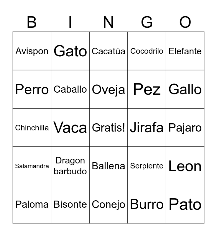 This bingo card has a free space and 42 words: Tarantula, Oveja, Cerdo, Dragon barbudo, Burro, Leon, Pato, Camaleon, Cacatúa, Ballena, Pajaro, Gallo, Vaca, Elefante, Oso, Serpiente, Gecko leopardo, Chinchilla, Mosquito, Gato, Perro, Falcón, Tortuga, Avispon, Bicho, La libélula, Pez, Ardilla, Hipopótamo, Guppy, Canaria, Salamandra, Caballo, Conejo, Alpaca, Paloma, Bisonte, Jirafa, Flamenco, Mariposa, Cocodrilo and Abeja.