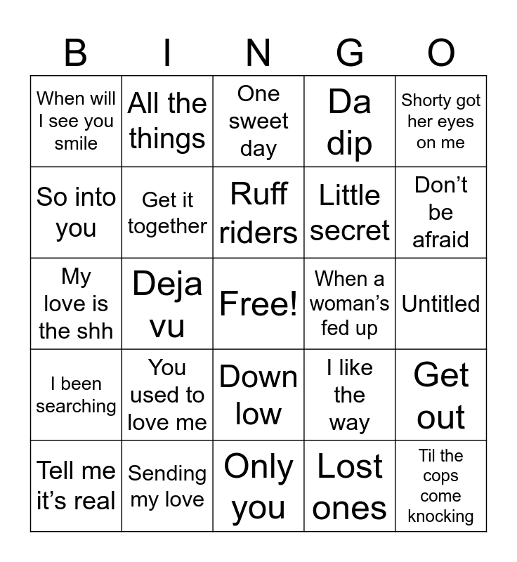 This bingo card has a free space and 24 words: You used to love me, Sending my love, Ruff riders, Tell me it’s real, Shorty got her eyes on me, When will I see you smile, So into you, All the things, When a woman’s fed up, Down low, Little secret, My love is the shh, I like the way, Get out, Get it together, Lost ones, Untitled, One sweet day, Don’t be afraid, Deja vu, Til the cops come knocking, I been searching, Da dip and Only you.