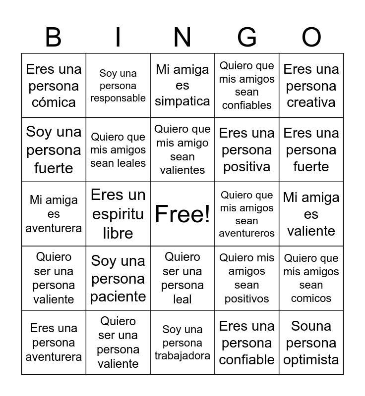This bingo card has a free space and 49 words: Soy una persona creativa, Souna persona optimista, Soy un espiritu Libre, Soy una persona trabajadora, Soy una persona paciente, Soy una persona sensible, Soy una persona responsable, Soy una persona emptica, Soy una persona fuerte, Soy una pesona leal, Quiero que mis amigos sean leales, Quiero que mis amigos sean confiables, Quiero que mis amigos sean comicos, Quiero mis amigos sean positivos, Quiero que mis amigos auntenticos, Quiero que mis amigos sean creativos, Quiero que mis amigo sean valientes, Quiero que mis amigos sean aventureros, Quiero que mis amigos sean fuertes, Eres una persona creativa, Eres un espiritu libre, Eres una persona confiable, Eres una persona cómica, Eres una persona positiva, eres una persona auténtica, Eres una persona fuerte, Eres una persona aventurera, Quiero ser una persona creativa, Quiero ser una persona leal, Quiero ser una persona valiente, Quiero ser una persona positiva, Quiero ser una persona auténtica, Quiero ser una persona mas segura de si misma, Quiero ser una persona tranquila, Quiero ser una persona valiente, Quiero ser más positivo(a), Mi amiga es fuerte, Mi amiga es un espiritu libre, Mi amiga es valiente, Mi amiga es responsable, Mi amiga es leal, Mi amiga es empática, Mi amiga es confiable, Mi amiga es auténtica, Mi amiga es aventurera, Mi amiga es simpatica, Mi amiga es cómica, Mi amiga es amable and Mi amiga es llevadera.