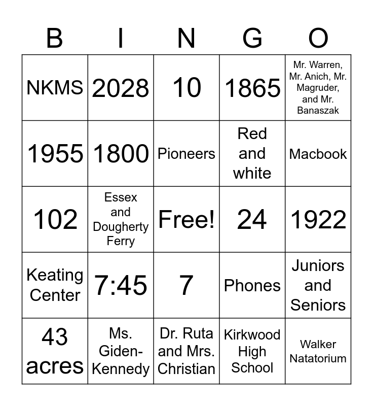 This bingo card has a free space and 24 words: 7:45, Ms. Giden-Kennedy, Pioneers, 43 acres, Mr. Warren, Mr. Anich, Mr. Magruder, and Mr. Banaszak, NKMS, 1955, 2028, 24, 7, Red and white, 102, Phones, Juniors and Seniors, 1800, Kirkwood High School, 1922, 10, Macbook, Essex and Dougherty Ferry, Walker Natatorium, Keating Center, 1865 and Dr. Ruta and Mrs. Christian.