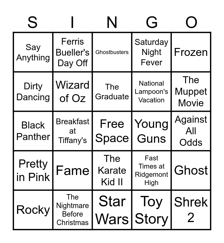 This bingo card has a free space and 74 words: Footloose, The Bodyguard, Ghostbusters, Beaches, Trolls, 9 to 5, 8 Mile, Titanic, Rocky, The Lion King, The Breakfast Club, Pretty Woman, The Graduate, Dirty Dancing, Top Gun, Breakfast at Tiffany's, The Sound of Music, The Muppet Movie, A Star is Born, Black Panther, Wizard of Oz, Ferris Bueller's Day Off, Saturday Night Fever, Philadelphia, Shrek 2, The Lego Movie, Skyfall, The Pink Panther, La La Land, Begin Again, Frozen, 50 Shades of Gray, Men in Black, James Bond 007, The Twilight Saga, Toy Story, Purple Rain, Despicable Me, Halloween, Jaws, Star Wars, The Nightmare Before Christmas, Flashdance, Shaft, Bridesmaids, Say Anything, Bohemian Rhapsody, Fame, Reservoir Dogs, Jerry Maguire, Midnight Cowboy, Almost Famous, Against All Odds, Mannequin, The Woman in Red, Back to the Future, The Karate Kid II, Arthur, Risky Business, Ghost, National Lampoon's Vacation, Beverly Hills Cop, Pretty in Pink, Short Circuit, Young Guns, Robin Hood: Prince of Thieves, That Thing You Do!, Cocktail, Fast Times at Ridgemont High, My Best Friend's Wedding, The Goonies, Animal House, An Officer and A Gentleman and Eddie & The Cruisers.