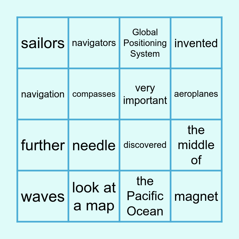This bingo card has 16 words: look at a map, the middle of, Global Positioning System, sailors, further, navigators, discovered, the Pacific Ocean, navigation, compasses, waves, invented, needle, aeroplanes, very important and magnet.