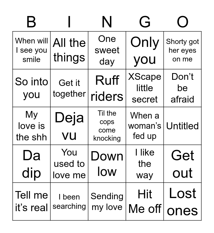 This bingo card has 25 words: You used to love me, Sending my love, Ruff riders, Tell me it’s real, Shorty got her eyes on me, When will I see you smile, So into you, All the things, When a woman’s fed up, Down low, XScape little secret, My love is the shh, I like the way, Get out, Get it together, Lost ones, Untitled, One sweet day, Don’t be afraid, Deja vu, Til the cops come knocking, I been searching, Da dip, Only you and Hit Me off.