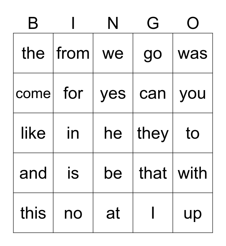 This bingo card has 31 words: at, it, in, on, the, we, for, that, they, I, to, he, up, are, you, have, with, is, and, be, was, she, this, from, can, come, go, like, no, yes and see.