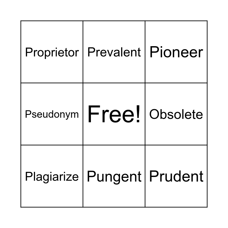 This bingo card has a free space and 8 words: Obsolete, Pioneer, Prevalent, Plagiarize, Proprietor, Prudent, Pseudonym and Pungent.