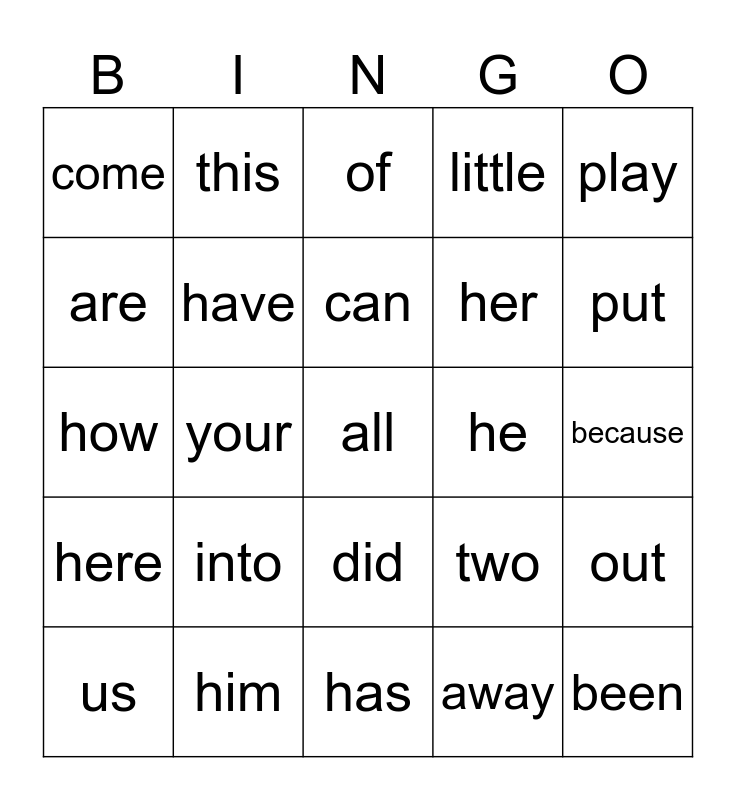 This bingo card has 49 words: who, all, by, has, into, or, this, will, are, came, have, little, out, two, with, as, can, he, look, play, your, away, come, her, make, put, us, back, did, here, man, said, very, from, him, not, saw, was, because, get, now, went, been, going, how, of, what, that and they.
