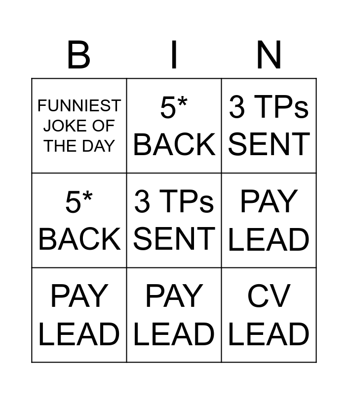 This bingo card has 9 words: PAY LEAD, 3 TPs SENT, 5* BACK, 5* BACK, FUNNIEST JOKE OF THE DAY, PAY LEAD, 3 TPs SENT, CV LEAD and PAY LEAD.