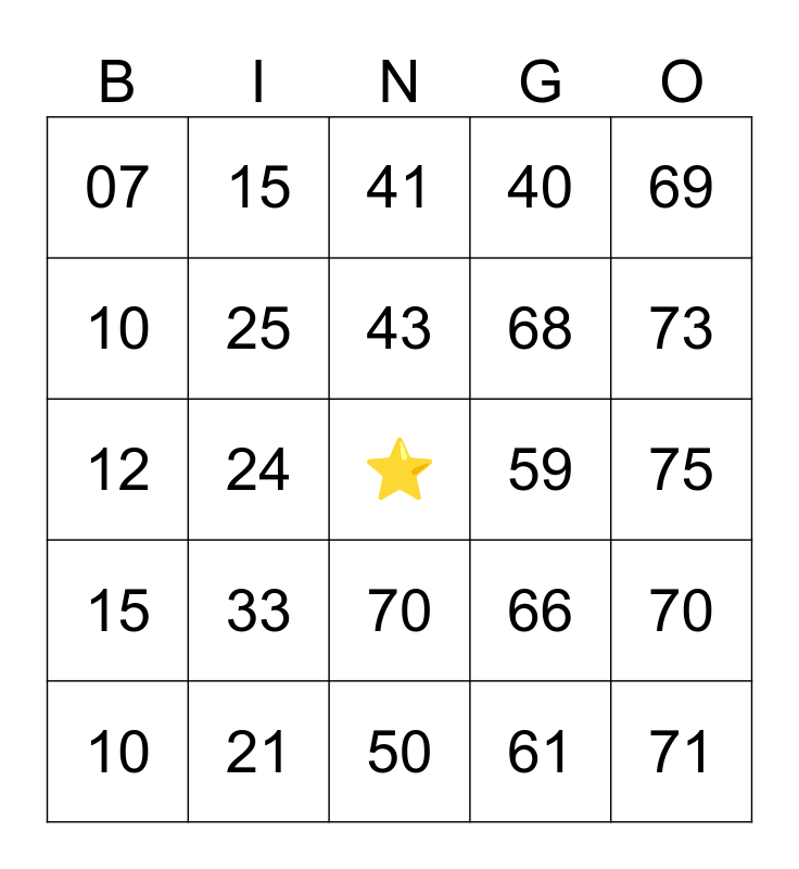 This bingo card has a free space and 29 words: 1, 21, 41, 57, 69, 07, 25, 43, 59, 70, 10, 24, 61, 71, 12, 30, 50, 66, 73, 15, 33, 52, 68, 75, 10, 15, 70, 40 and 20.
