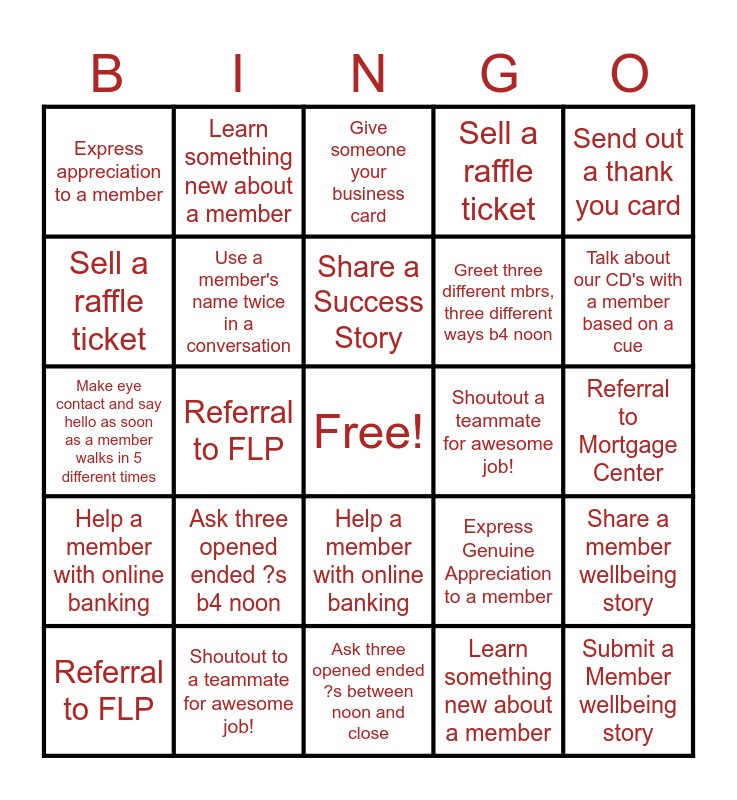 This bingo card has a free space and 24 words: Ask three opened ended ?s b4 noon, Shoutout to a teammate for awesome job!, Share a Success Story, Referral to FLP, Send out a thank you card, Express appreciation to a member, Sell a raffle ticket, Learn something new about a member, Shoutout a teammate for awesome job!, Help a member with online banking, Greet three different mbrs, three different ways b4 noon, Make eye contact and say hello as soon as a member walks in 5 different times, Express Genuine Appreciation to a member, Share a member wellbeing story, Use a member's name twice in a conversation, Learn something new about a member, Referral to Mortgage Center, Give someone your business card, Talk about our CD's with a member based on a cue, Referral to FLP, Submit a Member wellbeing story, Help a member with online banking, Sell a raffle ticket and Ask three opened ended ?s between noon and close.