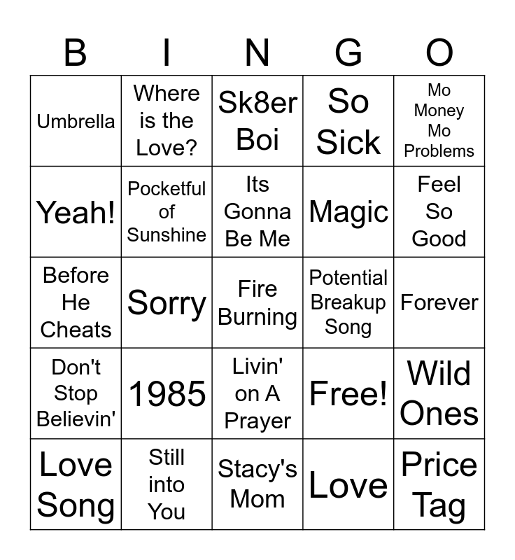 This bingo card has 25 words: 1985, Stacy's Mom, Its Gonna Be Me, Love Song, Mo Money Mo Problems, Umbrella, Yeah!, Where is the Love?, Potential Breakup Song, Livin' on A Prayer, Magic, Before He Cheats, Free!, Wild Ones, Pocketful of Sunshine, Price Tag, Forever, Sk8er Boi, Feel So Good, Sorry, Fire Burning, Still into You, Don't Stop Believin', So Sick and Love.