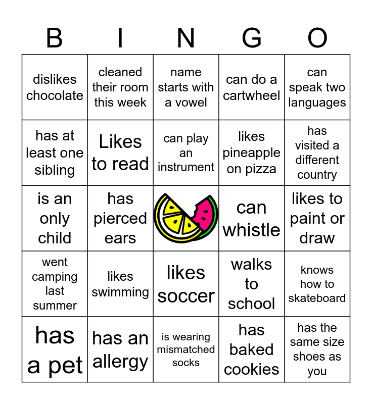 This bingo card has a free space and 24 words: likes swimming, has an allergy, can play an instrument, has a pet, can speak two languages, dislikes chocolate, has at least one sibling, cleaned their room this week, can whistle, likes soccer, likes pineapple on pizza, is an only child, walks to school, knows how to skateboard, Likes to read, has baked cookies, likes to paint or draw, name starts with a vowel, has visited a different country, has pierced ears, has the same size shoes as you, went camping last summer, can do a cartwheel and is wearing mismatched socks.