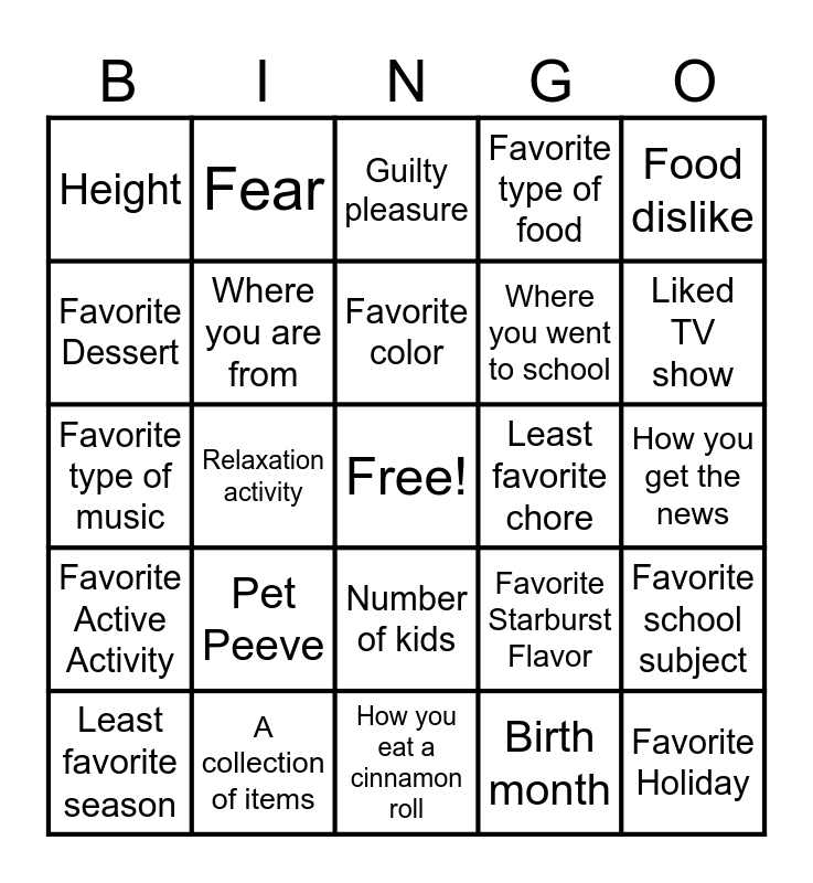 This bingo card has a free space and 35 words: A type of pet, Number of pets, Hobby, Where you are from, Number of kids, Favorite type of food, Favorite Dessert, Favorite type of vacation, Favorite color, Car color, Favorite type of music, Food dislike, Travel bucket list, Type of phone, Height, Least favorite chore, Birth month, Relaxation activity, Favorite Active Activity, Favorite Holiday, Favorite Starburst Flavor, Least favorite season, Favorite school subject, A collection of items, Guilty pleasure, Liked TV show, What you miss about childhood, Favorite brand, Where you went to school, How you get the news, Number of siblings, How you eat a cinnamon roll, Pet Peeve, Fear and Sleep schedule.