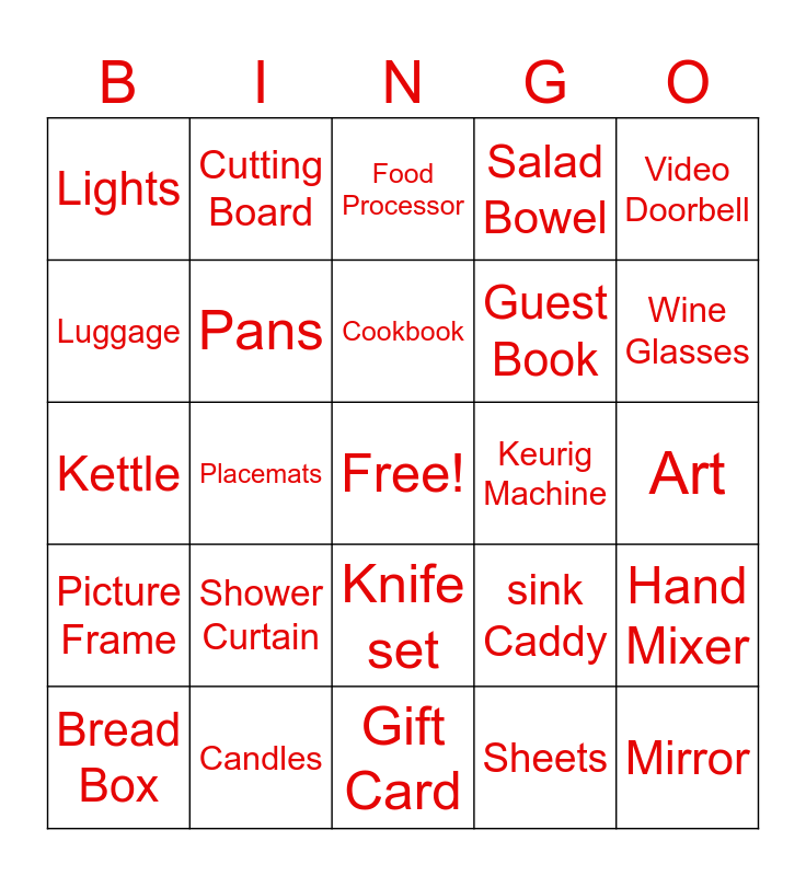 This bingo card has a free space and 45 words: Bench, Mirror, Hammock, Bread Box, Mat, Sheets, Food Processor, Bread Slicer, Video Doorbell, Candles, Salad Bowel, Keurig Machine, Knife set, Shower Curtain, Toaster, Gift Card, Air Fryer, Kettle, Towels, Wine Glasses, Cutting Board, Bakeware set, Frying Pan, Lights, Vase, Art, Lingerie, Dutch oven, sink Caddy, Picture Frame, Storage Containers, Hand Mixer, Trash Can, Blanket, Oil/Vinegar Bottles, Placemats, Charcuterie Board, Champange Flutes, oven mitts, Cookbook, Luggage, Guest Book, Coffee mugs, Pans and Soups.