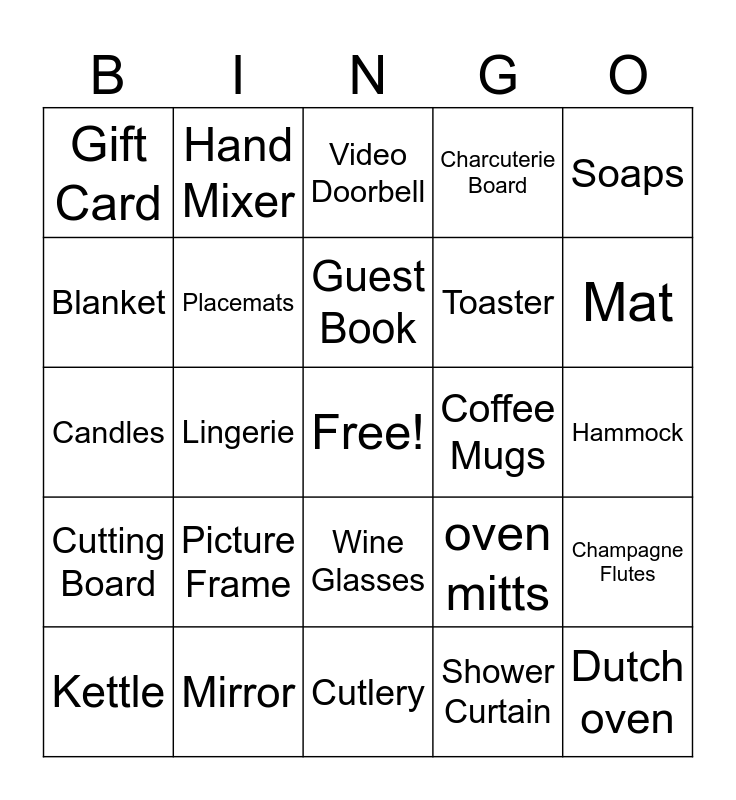 This bingo card has a free space and 46 words: Glass Bakeware, Dutch oven, Sink Caddy, Cutlery, Picture Frame, Storage containers, Hand Mixer, Trash can, Blanket, oil/vinegar Bottle, Placemats, Charcuterie Board, Champagne Flutes, oven mitts, Cook book, Luggage, Guest Book, Coffee Mugs, Pans, Soaps, Lingerie, Shower Curtain, Gift Card, Toaster, Air Fryer, Mat, Kettle, Towels, Wine Glasses, Cutting Board, Frying pan, Lights, Vase, Art, Bench, Mirror, Hammock, Bread Box, Sheets, Food Processor, Bread Slicer, Video Doorbell, Candles, Salad Bowl, Keurig Machine and Knife Set.
