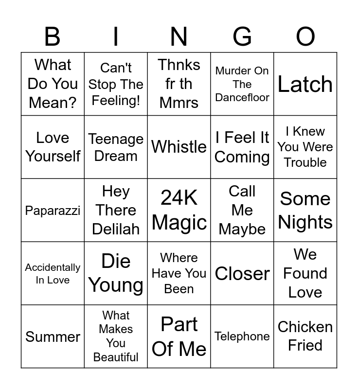 This bingo card has a free space and 24 words: Die Young, What Makes You Beautiful, Whistle, Summer, Latch, What Do You Mean?, Love Yourself, Can't Stop The Feeling!, Call Me Maybe, Where Have You Been, I Feel It Coming, Paparazzi, Closer, We Found Love, Teenage Dream, Telephone, Some Nights, Thnks fr th Mmrs, I Knew You Were Trouble, Hey There Delilah, Chicken Fried, Accidentally In Love, Murder On The Dancefloor and Part Of Me.
