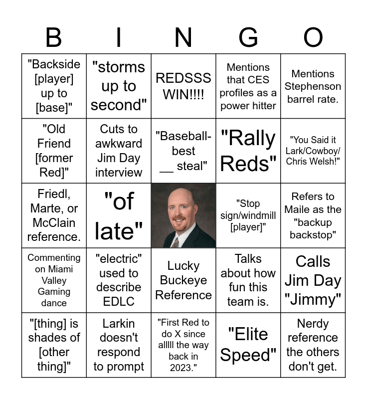 This bingo card has a free space and 24 words: "electric" used to describe EDLC, Larkin doesn't respond to prompt, "Baseball-best __ steal", "[thing] is shades of [other thing]", Mentions Stephenson barrel rate., "Backside [player] up to [base]", "Old Friend [former Red]", "storms up to second", "Stop sign/windmill [player]", Lucky Buckeye Reference, "Rally Reds", Friedl, Marte, or McClain reference., Talks about how fun this team is., Calls Jim Day "Jimmy", Cuts to awkward Jim Day interview, "Elite Speed", Refers to Maile as the "backup backstop", REDSSS WIN!!!!, "You Said it Lark/Cowboy/ Chris Welsh!", "of late", Nerdy reference the others don't get., Commenting on Miami Valley Gaming dance, Mentions that CES profiles as a power hitter and "First Red to do X since alllll the way back in 2023.".