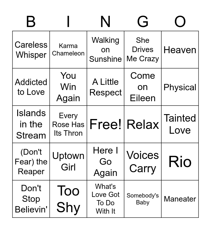 This bingo card has a free space and 70 words: Straight Up, Tainted Love, All Night Long (All Night), Kiss, Too Shy, Glory Days, She Drives Me Crazy, Break My Stride, Heaven, Rosanna, Rio, Fading Like a Flower, Careless Whisper, Walking on Sunshine, Heaven Is a Place on Earth, Every Rose Has Its Thron, Here I Go Again, Come on Eileen, Juke Box Hero, (Don't Fear) the Reaper, Relax, Voices Carry, Physical, Jack & Diane, Broken Wings, Faith, It's Raining Men, More Than a Feeling, Somebody's Baby, Video Killed the Radio Star, Karma Chameleon, Never Gonna Give You Up, Need You Tonight, True, Alone, Papa Don't Preach, Radio Ga Ga, I'm Still Standing, The Boys of Summer, Addicted to Love, Take My Breath Away, Uptown Girl, Maneater, Time After Time, I Just Called to Say I Love You, You Win Again, Don't Stop Believin', Sexual Healing, (I've Had the) Time of My Life, Nothing's Gonna Stop Us Now, Total Eclipse of the Heart, Wake Me Up Before You Go-Go, Against All Odds, Flashdance (What a Feeling), What's Love Got To Do With It, Eternal Flame, A Little Respect, Don't You Forget About Me, Thriller, Summer of 69, Islands in the Stream, Like a Prayer, Everybody Wants to Rule the World, Take on Me, I Wanna Dance With Somebody, Africa, In the Air Tonight, I Want to Break Free, Billie Jean and Purple Rain.