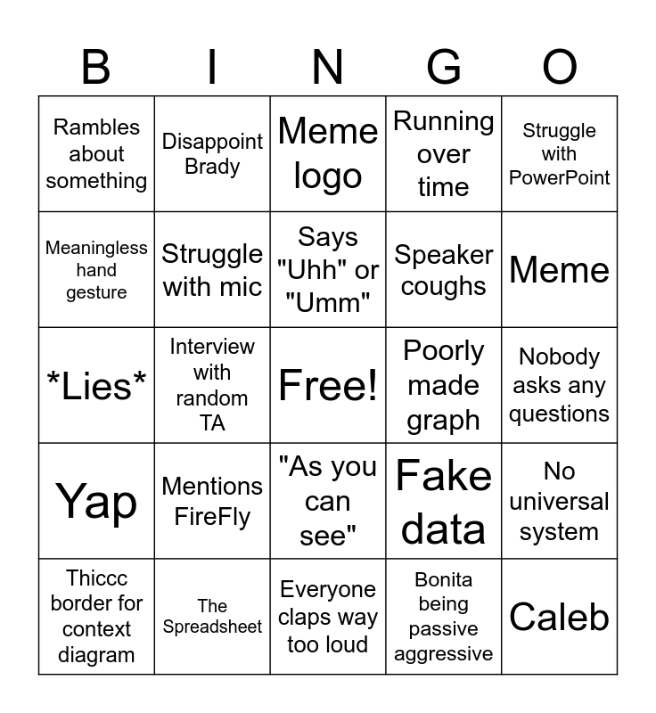 This bingo card has a free space and 24 words: Mentions FireFly, The Spreadsheet, Says "Uhh" or "Umm", Thiccc border for context diagram, Struggle with PowerPoint, Rambles about something, Meaningless hand gesture, Disappoint Brady, Poorly made graph, "As you can see", Speaker coughs, *Lies*, Fake data, No universal system, Struggle with mic, Bonita being passive aggressive, Nobody asks any questions, Meme logo, Meme, Interview with random TA, Caleb, Yap, Running over time and Everyone claps way too loud.