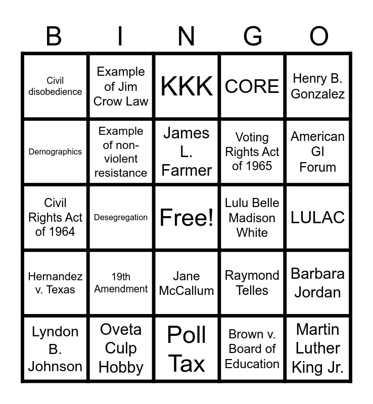 This bingo card has a free space and 24 words: 19th Amendment, Oveta Culp Hobby, James L. Farmer, Lyndon B. Johnson, Henry B. Gonzalez, Civil disobedience, Demographics, Example of Jim Crow Law, Lulu Belle Madison White, Jane McCallum, Voting Rights Act of 1965, Civil Rights Act of 1964, Raymond Telles, Barbara Jordan, Example of non-violent resistance, Brown v. Board of Education, LULAC, KKK, American GI Forum, Desegregation, Martin Luther King Jr., Hernandez v. Texas, CORE and Poll Tax.