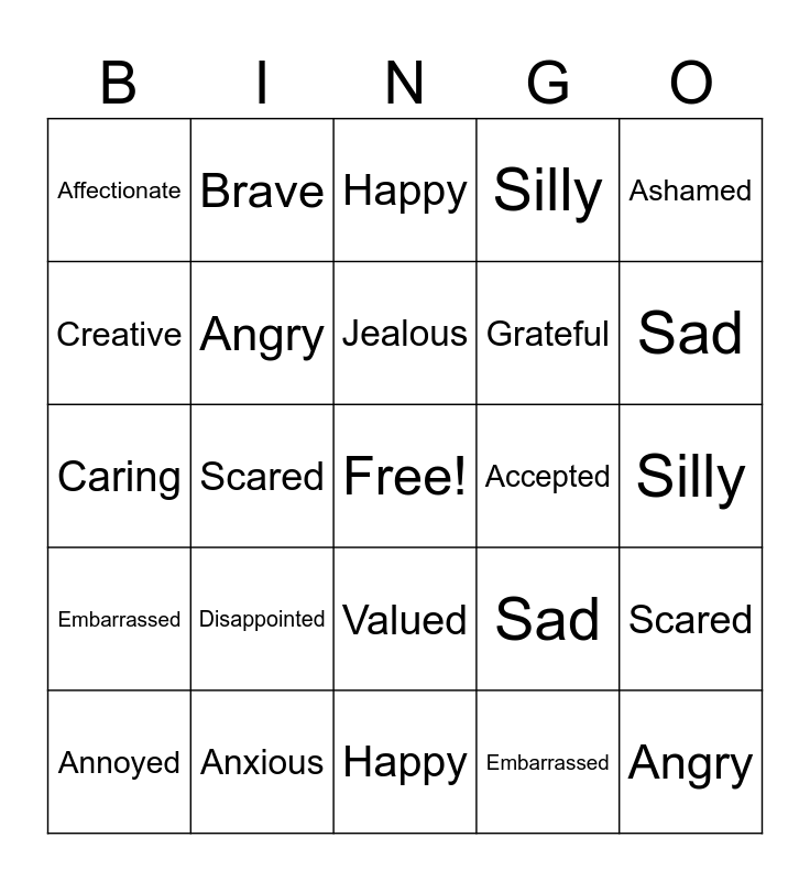 This bingo card has a free space and 24 words: Disappointed, Anxious, Jealous, Annoyed, Ashamed, Affectionate, Creative, Brave, Accepted, Valued, Grateful, Caring, Sad, Scared, Angry, Embarrassed, Silly, Happy, Sad, Scared, Angry, Embarrassed, Silly and Happy.