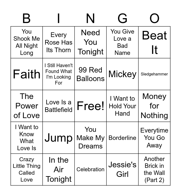 This bingo card has a free space and 51 words: Sure, here's the list of popular 80s songs without quotes and bullet points:, Another Brick in the Wall (Part 2), Walking on Sunshine, Celebration, Jump, Don't Stop 'Til You Get Enough, Every Rose Has Its Thorn, Love Shack, Faith, I Love It Loud, I Still Haven't Found What I'm Looking For, You Give Love a Bad Name, Everytime You Go Away, Borderline, Summer of '69, Owner of a Lonely Heart, 99 Red Balloons, I Want to Hold Your Hand, I'm So Excited, Beat It, Love Is a Battlefield, Jessie's Girl, You Shook Me All Night Long, Mickey, I Wanna Rock, Take My Breath Away, Sledgehammer, We Built This City, Crazy Little Thing Called Love, Need You Tonight, Rock the Casbah, Never Too Much, Centerfold, Love Will Tear Us Apart, When Doves Cry, In the Air Tonight, The Boys of Summer, Every Breath You Take, Sunglasses at Night, Red Red Wine, Money for Nothing, I Want to Know What Love Is, She Drives Me Crazy, Physical, Sweet Dreams (Are Made of This), Just Can't Get Enough, The Power of Love, Africa, I Can't Go for That (No Can Do), You Make My Dreams and Like a Prayer.