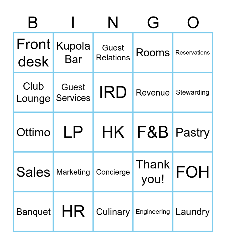 This bingo card has 30 words: HR, Finance, LP, Purchasing, Front desk, Guest Relations, Guest Services, Concierge, F&B, Culinary, Pastry, HK, Engineering, Laundry, Stewarding, Spa, Thank you!, Sales, Marketing, Reservations, Ottimo, Kupola Lounge, Kupola Bar, Revenue, Club Lounge, Rooms, FOH, Banquet, IRD and The Ritz-Carlton, Budapest.