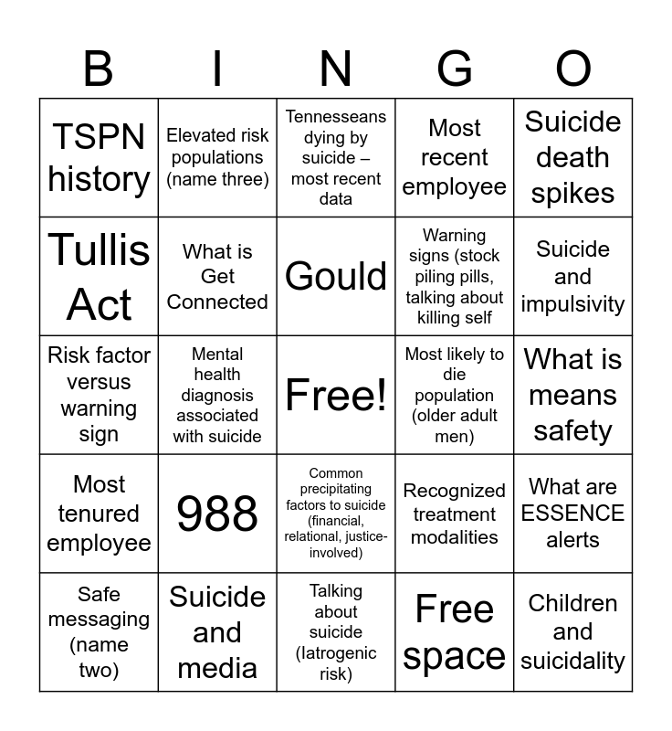 This bingo card has a free space and 25 words: 988, Talking about suicide (Iatrogenic risk), Gould, Safe messaging (name two), Suicide death spikes, TSPN history, Tullis Act, Elevated risk populations (name three), Most likely to die population (older adult men), Common precipitating factors to suicide (financial, relational, justice-involved), Warning signs (stock piling pills, talking about killing self, Risk factor versus warning sign, Recognized treatment modalities, What are ESSENCE alerts, What is Get Connected, Screening for suicidal ideation, What is means safety, Tennesseans dying by suicide – most recent data, Suicide and impulsivity, Mental health diagnosis associated with suicide, Children and suicidality, Suicide and media, Most tenured employee, Most recent employee and Free space.