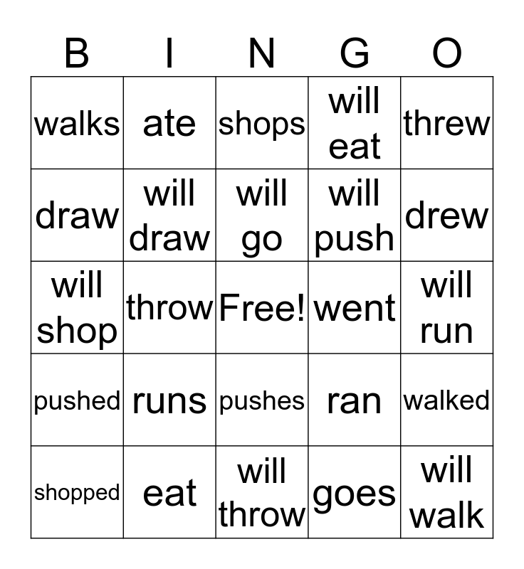 This bingo card has a free space and 24 words: runs, eat, will go, shopped, threw, walks, draw, ate, went, pushes, will push, will shop, ran, walked, will draw, goes, will run, shops, drew, throw, will walk, pushed, will eat and will throw.