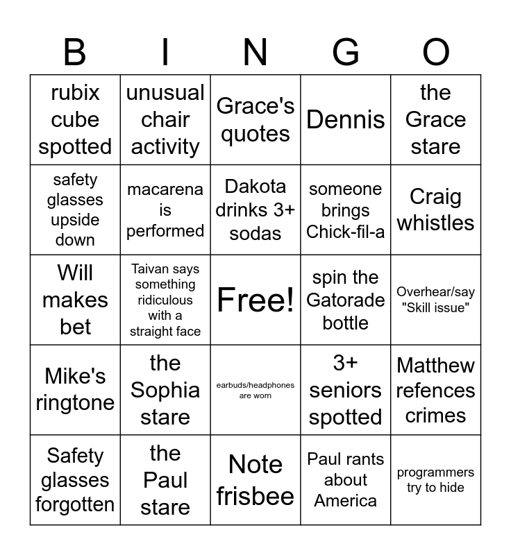 This bingo card has a free space and 29 words: Safety glasses forgotten, Eric makes a corny joke, Taivan says something ridiculous with a straight face, Game theory/ YouTube reference, rubix cube spotted, Grace's quotes, macarena is performed, the Sophia stare, spin the Gatorade bottle, the Paul stare, Overhear/say "Skill issue", programmers try to hide, Note frisbee, Paul rants about America, Craig whistles, someone disses on fusion, earbuds/headphones are worn, Mike's ringtone, the Grace stare, Will makes bet, 3+ seniors spotted, Grace is called "Child of the Attic", someone brings Chick-fil-a, safety glasses upside down, Dennis, unusual chair activity, Matthew refences crimes, Dakota drinks 3+ sodas and pun is made.