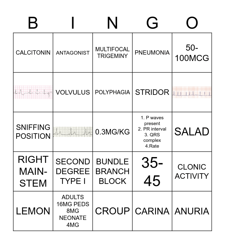 This bingo card has 6 images and 44 words: HEMIPELIGIA, 0.3MG/KG, CHOLINERGIC, CROUP, SECOND DEGREE TYPE I, ANTAGONIST, EMPHYSEMA, SOMATIC PAIN, VOLVULUS, PNEUMONIA, CLONIC ACTIVITY, 35-45, AGONAL, ALTERED LOC, POLYPHAGIA, 1. P waves present 2. PR interval 3. QRS complex 4.Rate, 50-100MCG, CARINA, CALCITONIN, STRIDOR, NON-BARBITUATE DISSOCIATIVE ANESTHETIC, ANURIA, CHRONIC KIDNEY DISEASE (CKD), MULTIFOCAL TRIGEMINY, BUNDLE BRANCH BLOCK, ADRENERGIC AGONIST, COPD AND ASTHMA, JUNCTIONAL RHYTHM, 3-10MG, ADULTS 16MG PEDS 8MG NEONATE 4MG, PULMONARY EDEMA, CORMACK LEHANE, BAAM, VALECULLA, SALAD, SOLUMEDROL, D.O.P.E.S., ETOMIDATE, PULMONARY EMBOLISM, LEMON, SNIFFING POSITION, NASOGASTRIC TUBE, KUSSMAUL RESPIRATIONS and RIGHT MAIN-STEM.