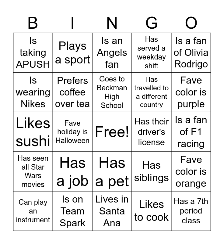 This bingo card has a free space and 24 words: Has a job, Is on Team Spark, Goes to Beckman High School, Can play an instrument, Is a fan of Olivia Rodrigo, Is taking APUSH, Is wearing Nikes, Plays a sport, Has their driver's license, Has a pet, Has travelled to a different country, Likes sushi, Has siblings, Fave color is orange, Prefers coffee over tea, Likes to cook, Is a fan of F1 racing, Is an Angels fan, Fave color is purple, Fave holiday is Halloween, Has a 7th period class, Has seen all Star Wars movies, Has served a weekday shift and Lives in Santa Ana.