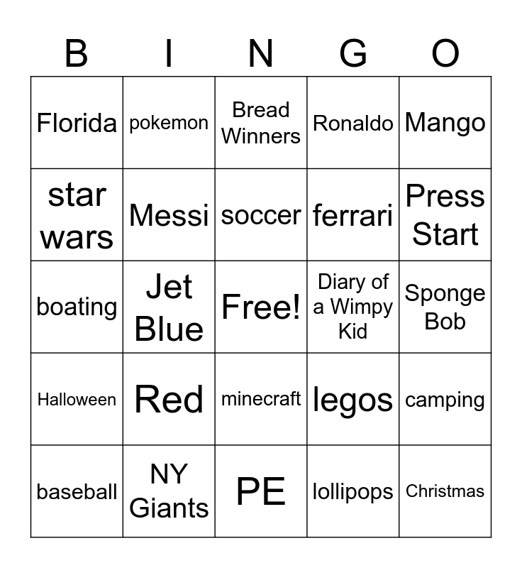 This bingo card has a free space and 24 words: Red, NY Giants, soccer, baseball, Mango, Florida, star wars, pokemon, Diary of a Wimpy Kid, minecraft, ferrari, boating, legos, camping, Messi, lollipops, Sponge Bob, Bread Winners, Press Start, Jet Blue, Christmas, Halloween, Ronaldo and PE.