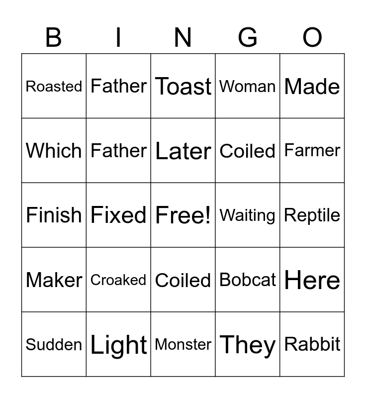 This bingo card has a free space and 29 words: Sudden, Mother, Fixed, Waited, Roasted, Toast, Father, Croaked, Waiting, Light, Reptile, Rabbit, Monster, They, Farmer, Which, Coiled, Maker, Made, Finish, Bobcat, Taken, Coiled, Which, Woman, Father, Here, Later and Missed.