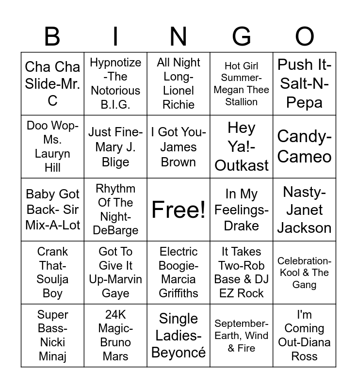 This bingo card has a free space and 42 words: Respect-Aretha Franklin, I Got You- James Brown, Superstition-Stevie Wonder, Got To Give It Up-Marvin Gaye, September-Earth, Wind & Fire, Celebration-Kool & The Gang, I'm Coming Out-Diana Ross, Before I Let Go- Maze & Frankie Beverly, All Night Long- Lionel Richie, Electric Boogie-Marcia Griffiths, Nasty-Janet Jackson, Candy-Cameo, Rhythm Of The Night-DeBarge, Push It- Salt-N-Pepa, I Wanna Dance with Somebody (Who Loves Me)- Whitney Houston, It Takes Two-Rob Base & DJ EZ Rock, Poison- Bell Biv DeVoe, Baby Got Back- Sir Mix-A-Lot, This Is How We Do It- Montell Jordan, Hypnotize -The Notorious B.I.G., Doo Wop- Ms. Lauryn Hill, No Scrubs-TLC, Be Faithful-Fatman Scoop, The Crooklyn Clan, Cha Cha Slide-Mr. C, Hot In Herre- Nelly, In Da Club- 50 Cent, Hey Ya!- Outkast, Yeah! USHER, Lil Jon, Ludacris, Lose Control- Missy Elliott, Ciara, Fatman Scoop, Cupid Shuffle-Cupid, Low- Flo Rida, T-Pain, Crank That- Soulja Boy, Just Fine-Mary J. Blige, Single Ladies- Beyoncé, Wobble- V.I.C., Super Bass-Nicki Minaj, 24K Magic-Bruno Mars, In My Feelings- Drake, SICKO MODE- Travis Scott, Truth Hurts-Lizzo, Hot Girl Summer- Megan Thee Stallion and Blinding Lights-The Weeknd.