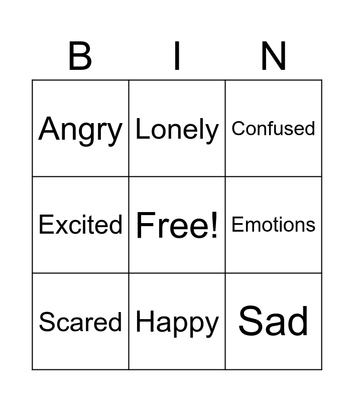 This bingo card has a free space and 10 words: Happy, Confused, Angry, Sad, Excited, Scared, Lonely, Disappointed, Emotions and Love.