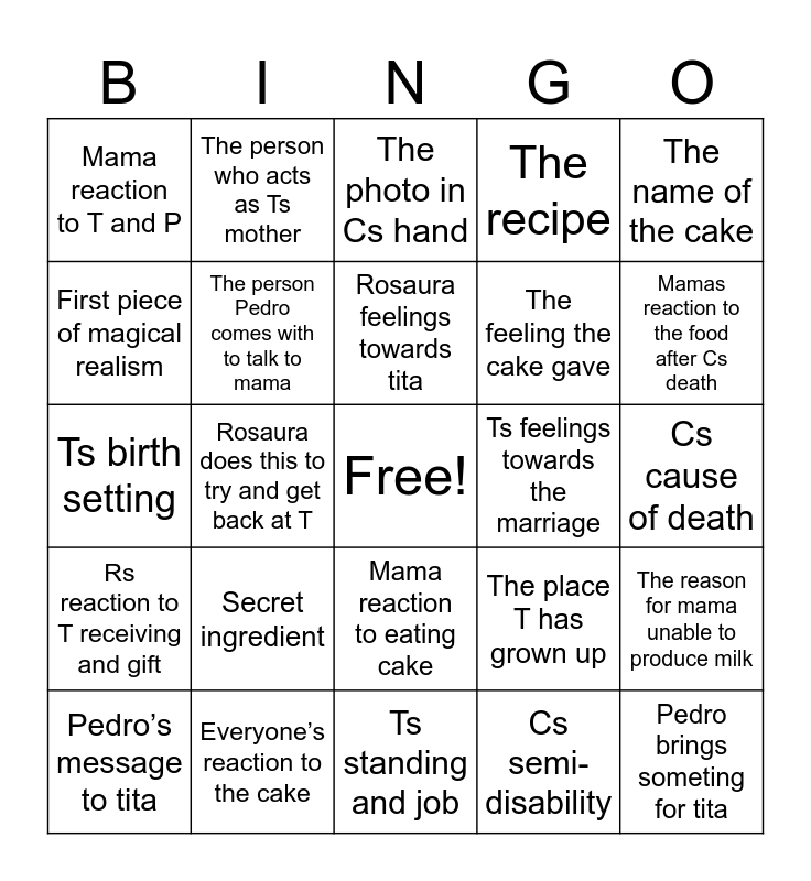 This bingo card has a free space and 24 words: Secret ingredient, Everyone’s reaction to the cake, Rosaura feelings towards tita, Pedro’s message to tita, The name of the cake, Mama reaction to T and P, First piece of magical realism, The person who acts as Ts mother, Ts feelings towards the marriage, Mama reaction to eating cake, The feeling the cake gave, Ts birth setting, The place T has grown up, The reason for mama unable to produce milk, The person Pedro comes with to talk to mama, Cs semi-disability, Cs cause of death, The photo in Cs hand, Mamas reaction to the food after Cs death, Rosaura does this to try and get back at T, Pedro brings someting for tita, Rs reaction to T receiving and gift, The recipe and Ts standing and job.