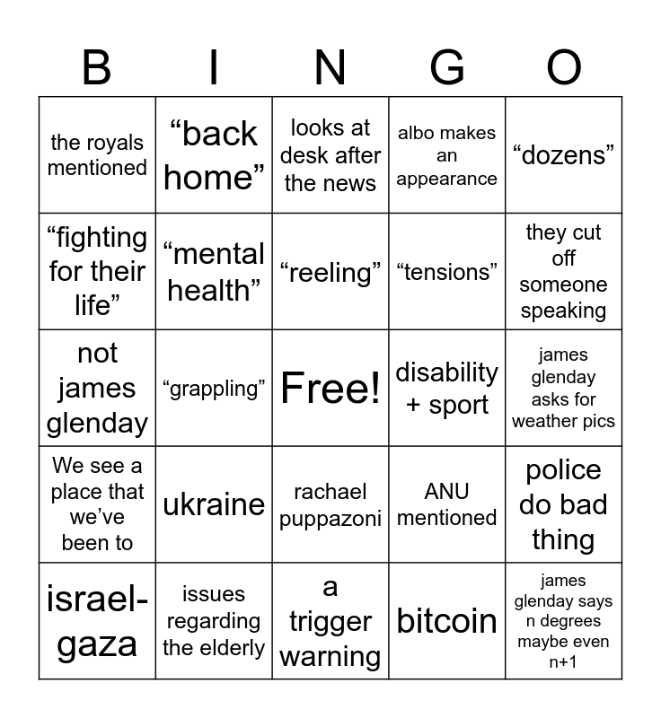 This bingo card has a free space and 44 words: olympics, james glenday says n degrees maybe even n+1, david pocock/ bald white guy that looks similar, israel-gaza, biden, bitcoin, looks at desk after the news, canberra sports team loses, “dozens”, issues regarding the elderly, albo makes an appearance, disability + sport, rachael puppazoni, ukraine, the presenter slips up, a trigger warning, expressive statement during the weather, not james glenday, local institution, they cut off someone speaking, “back home”, trump, india reference, the royals mentioned, they say “gen z”, james glenday asks for weather pics, hot weather, women’s sport before men’s, ANU mentioned, We see a place that we’ve been to, “cost of living crisis”, police do bad thing, dead white woman, it is forecasted to rain tomorrow, “grappling”, china, shane rattenbury, gay, “reeling”, “fighting for their life”, “tensions”, sheep grazier warning, “mental health” and weed reference.