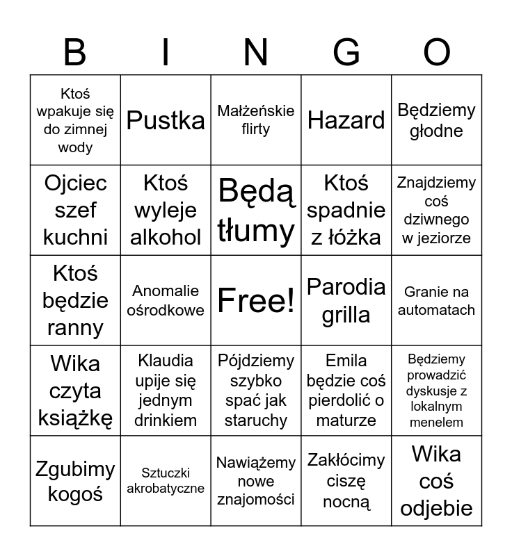 This bingo card has a free space and 24 words: Klaudia upije się jednym drinkiem, Sztuczki akrobatyczne, Będą tłumy, Zgubimy kogoś, Będziemy głodne, Ktoś wpakuje się do zimnej wody, Ojciec szef kuchni, Pustka, Parodia grilla, Pójdziemy szybko spać jak staruchy, Ktoś spadnie z łóżka, Ktoś będzie ranny, Emila będzie coś pierdolić o maturze, Będziemy prowadzić dyskusje z lokalnym menelem, Ktoś wyleje alkohol, Zakłócimy ciszę nocną, Granie na automatach, Małżeńskie flirty, Znajdziemy coś dziwnego w jeziorze, Anomalie ośrodkowe, Wika coś odjebie, Wika czyta książkę, Hazard and Nawiążemy nowe znajomości.