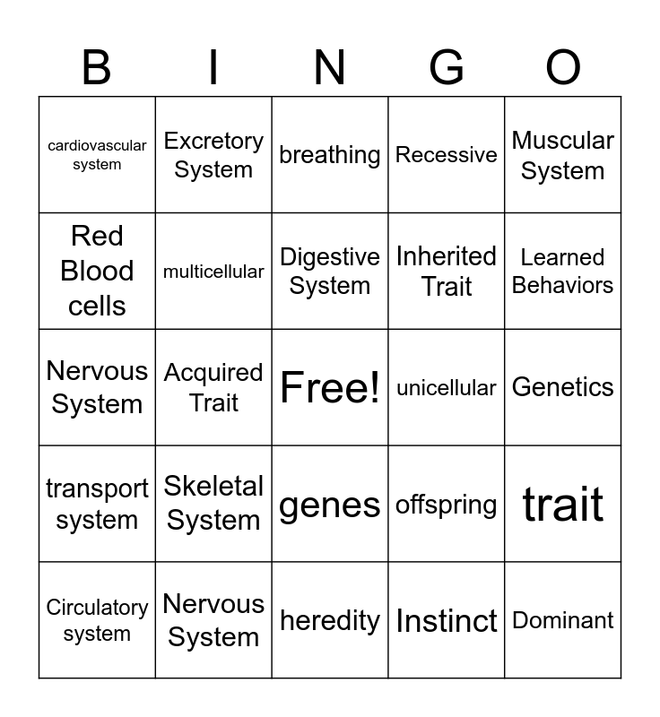 This bingo card has a free space and 24 words: Skeletal System, Nervous System, Digestive System, Circulatory system, Muscular System, cardiovascular system, Red Blood cells, Excretory System, unicellular, genes, Inherited Trait, Nervous System, offspring, trait, multicellular, Instinct, Genetics, breathing, Learned Behaviors, Acquired Trait, Dominant, transport system, Recessive and heredity.