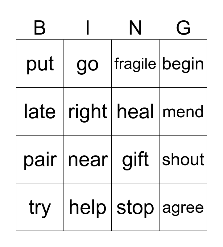 This bingo card has 32 words: every, ill, shout, close, agree, heal, late, finish, go, locate, mend, fragile, often, own, help, build, below, gift, thin, error, brave, allow, stop, want, try, begin, pair, right, put, hide, huge and near.