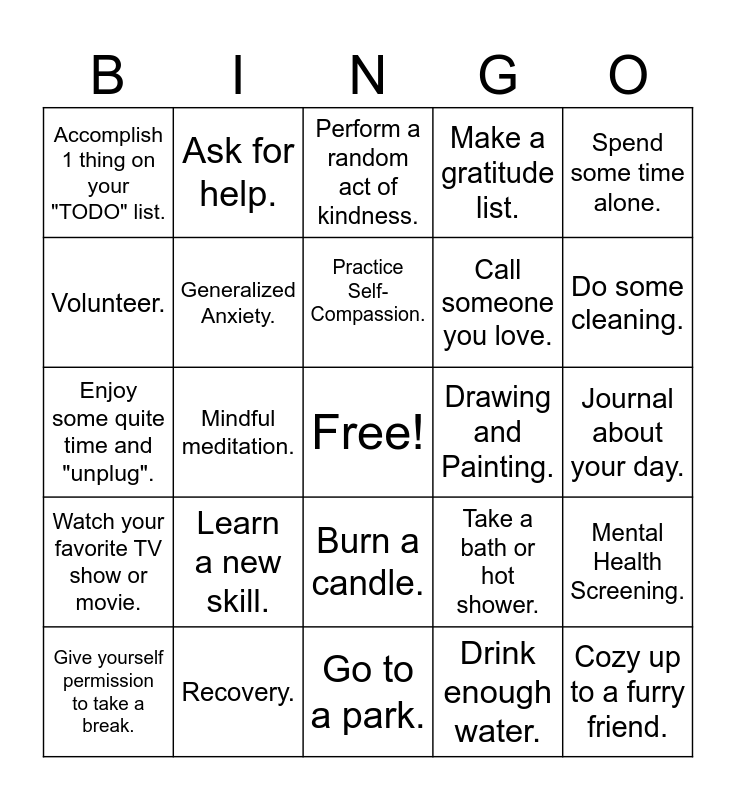 This bingo card has a free space and 72 words: Positive self-talk., Ask for help., Mindful meditation., Smile., Read a book., May is Mental Health Awareness Month., Make a gratitude list., Do yoga., Call someone you love., Take time to laugh., Give yourself permission to take a break., Listen to music., Do some cleaning., Accomplish 1 thing on your "TODO" list., Talk to a counselor., Enjoy some quite time and "unplug"., Take a bath or hot shower., Spend some time alone., Allow yourself to rest., Journal about your day., Learn a new skill., Cozy up to a furry friend., Mental Health Screening., Enjoy sunshine., Take a work break., Be kind to someone., Try something new., Read a book., Spend time outdoors., Do deep breathing exercises., Recovery., Peer Support., Love your mind., Get 8 hours of sleep., Drink enough water., Take deep breaths., 988, Catch up with a friend., Volunteer., Align values to behavior., Burn a candle., Text "4HOPE" to 741 741 for the Crisis Line., Take a walk., Validate your own feelings., Mental Health Matters., Watch your favorite TV show or movie., Try a new restaurant., Celebrate the small wins., Know your limits., Garden., Declutter and organize your space., Relaxation techniques., Healthy Eating., Drawing and Painting., Knit or sew., Create a vision board., Perform a random act of kindness., Practice Self-Compassion., Talk to your spiritual advisor., Compliment yourself., Ride a bike., Take a long drive., No social media for a day., Go to a park., Stigma., Seasonal Affective Disorder., Generalized Anxiety., Major Depressive Disorder., 1 in 5, Illness is not your idenity, There is hope. and Love yourself..