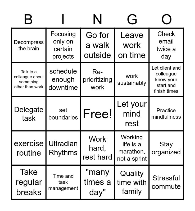This bingo card has a free space and 24 words: Ultradian Rhythms, Time and task management, Re-prioritizing work, Take regular breaks, Check email twice a day, Decompress the brain, Talk to a colleague about something other than work, Focusing only on certain projects, Let your mind rest, Work hard, rest hard, work sustainably, Delegate task, Working life is a marathon, not a sprint, Stay organized, schedule enough downtime, Quality time with family, Practice mindfullness, Go for a walk outside, Let client and colleague know your start and finish times, set boundaries, Stressful commute, exercise routine, Leave work on time and "many times a day".