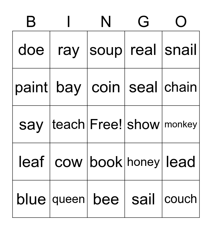 This bingo card has a free space and 37 words: noise, toe, rain, bay, lead, cow, coin, out, snail, gray, teach, real, couch, monkey, paint, leaf, haunt, soup, book, show, doe, chain, blue, bee, coal, sail, ray, cheese, pie, turkey, tea, queen, say, money, honey, seal and eat.